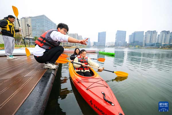 早春时节,一堂水上运动公开课在浙江省宁波市江北区甬江街道星湖公园进行。青年学员们划着皮划艇、桨板,在教练员指导下泛舟湖面,享受水上运动的乐趣。